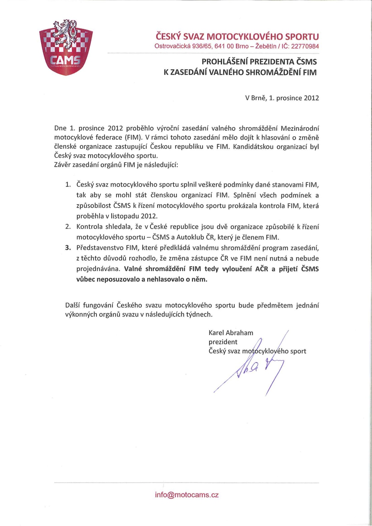 Prohlášení prezidenta ČSMS k zasedání valného shromáždění FIM 1.12.2012