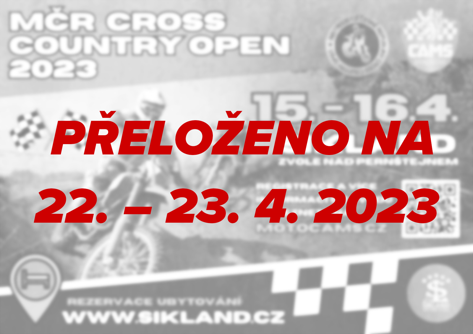 Z důvodu vytrvalého deště a nepříznivé předpovědi počasí se 1. podnik MČR a POHÁR CAMS Cross Country OPEN 2023 v Šiklově mlýně přesouvá na další víkend.