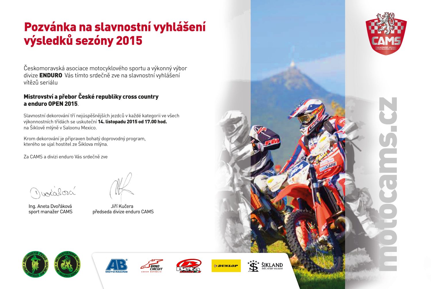POZVÁNKA NA VYHLÁŠENÍ SERIÁLŮ MČR ENDURO A CROSS COUNTRY 2015