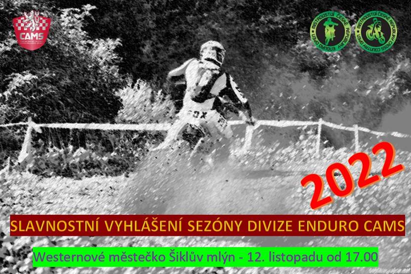 Srdečně vás zveme na slavnostní vyhlášení sezóny 2022 CAMS divize Enduro. Vyhlášení se uskuteční 12. listopadu od 17. hodin v areálu Western Šiklův Mlýn.