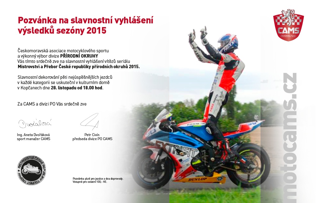Českomoravská asociace motocyklového sportu a výkonný výbor divize přírodních okruhů vás tímto srdečně zve na slavnostní vyhlášení vítězů seriálu Mistrovství a přebor České...