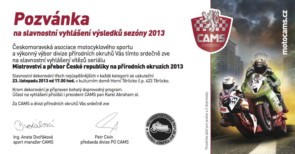Českomoravská asociace motocyklového sportu a výkonný výbor divize přírodních okruhů vás tímto srdečně zve na slavnostní vyhlášení vítězů seriálu Mistrovství a přebor České...